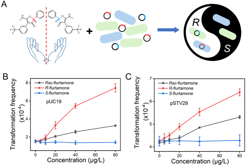 本研究以常用手性除草剂—呋草酮(flurtamone)为对象,通过高效液相色谱-质谱联用技术成功分离出其R-和S-对映体,并在环境相关浓度下系统评价了二者对ARGs水平转移的影响。结果显示,R-呋草酮能显著促进ARGs的转化效率,最高提升约4.8倍,而S-对映体则未表现出明显影响(图2)。