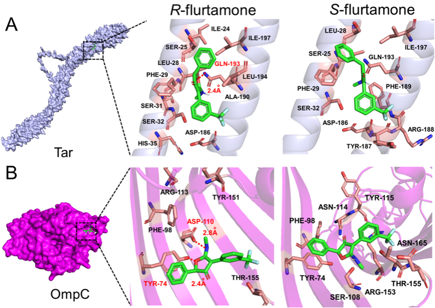 在机制层面,研究揭示R-呋草酮更易被细菌识别,进而引起细胞膜通透性增加、活性氧爆发、SOS应激反应增强及ATP水平上升,从而显著加速ARGs的传播过程。通过分子对接与动力学模拟,进一步从分子层面证实R-对映体与细菌膜蛋白(如Tar与OmpC)具有更强的结合能力(图3),从而触发更强烈的细胞应激响应。