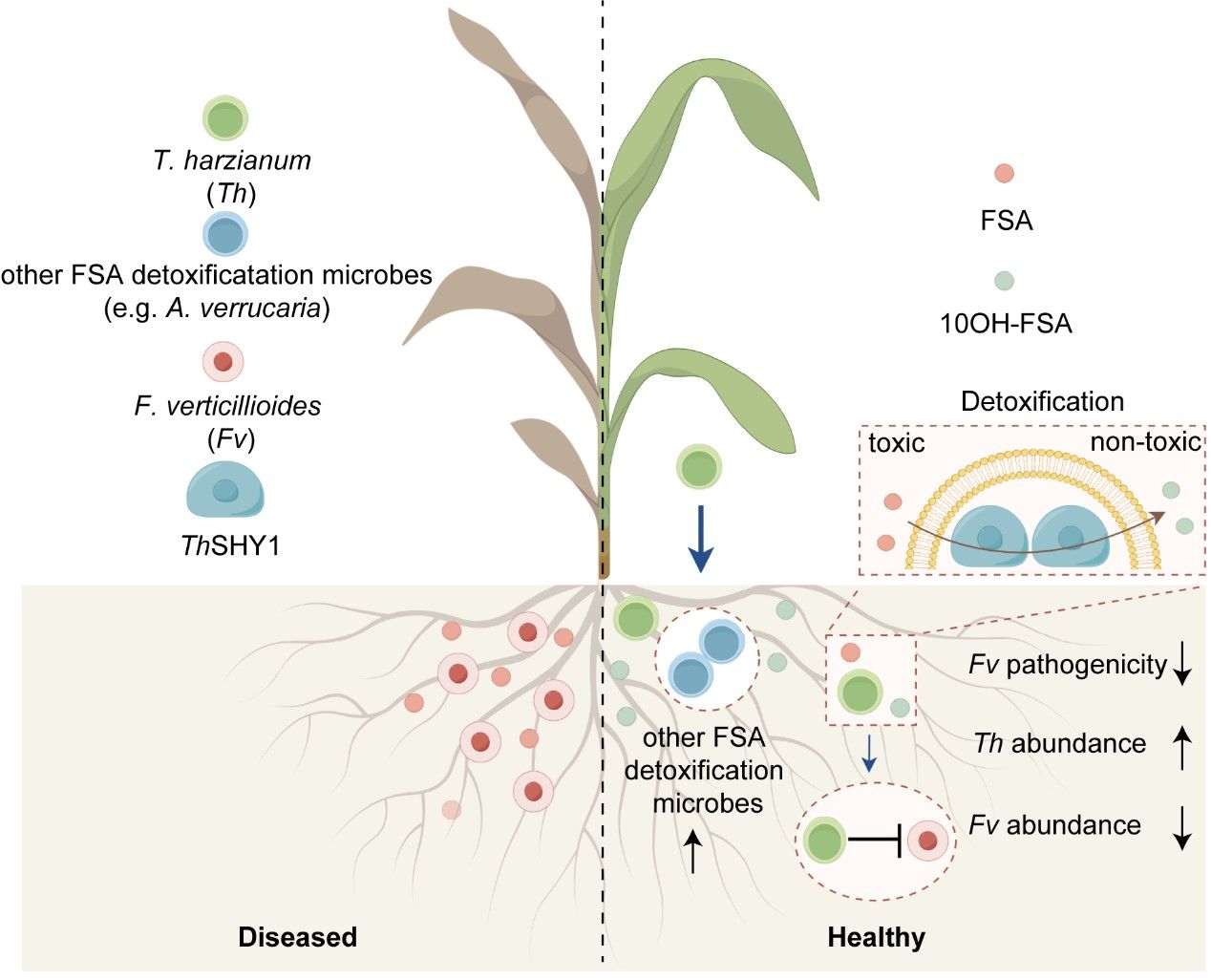 田间试验表明,哈茨木霉介导的FSA脱毒过程不仅削弱了串珠镰刀菌的毒性,还促进了其他具有FSA脱毒能力的根际微生物(如Albifimbria)的富集,从而在生态层面上增强了病害防控效应(图1)。