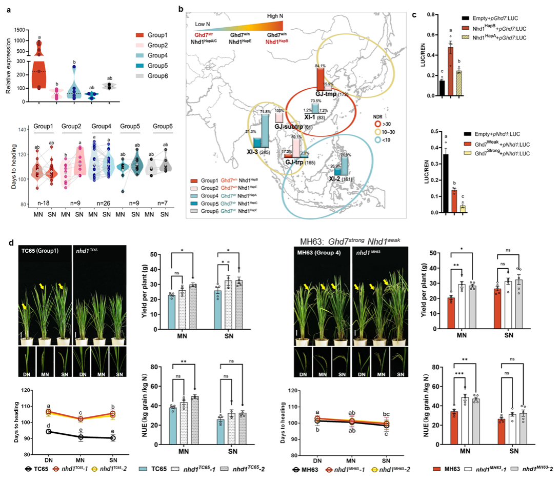 图2. 选择性聚合Ghd7、Nhd1等位变异具有改良生育期、产量及氮素利用效率的潜力。