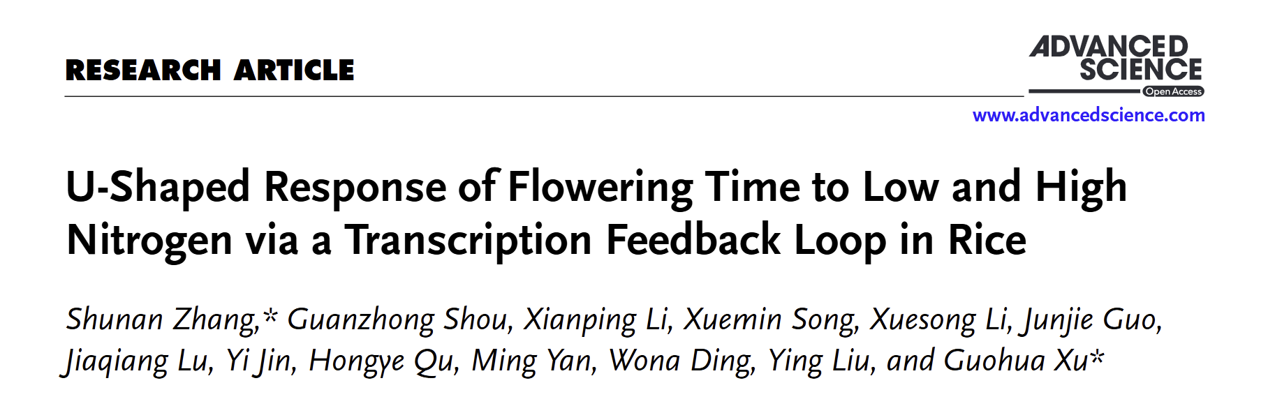 近日,南京农业大学徐国华团队在国际权威期刊《Advanced Science》发表了题为“U-Shaped Response of Flowering Time to Low and High Nitrogen via a Transcription Feedback Loop in Rice”的研究论文。该研究揭示了一个由氮调控开花促进因子Nhd1与开花抑制因子Ghd7构成的转录负反馈调控环,作为精密的分子开关适应不同供氮状况,调控水稻抽穗期对氮肥响应的U-型模式。