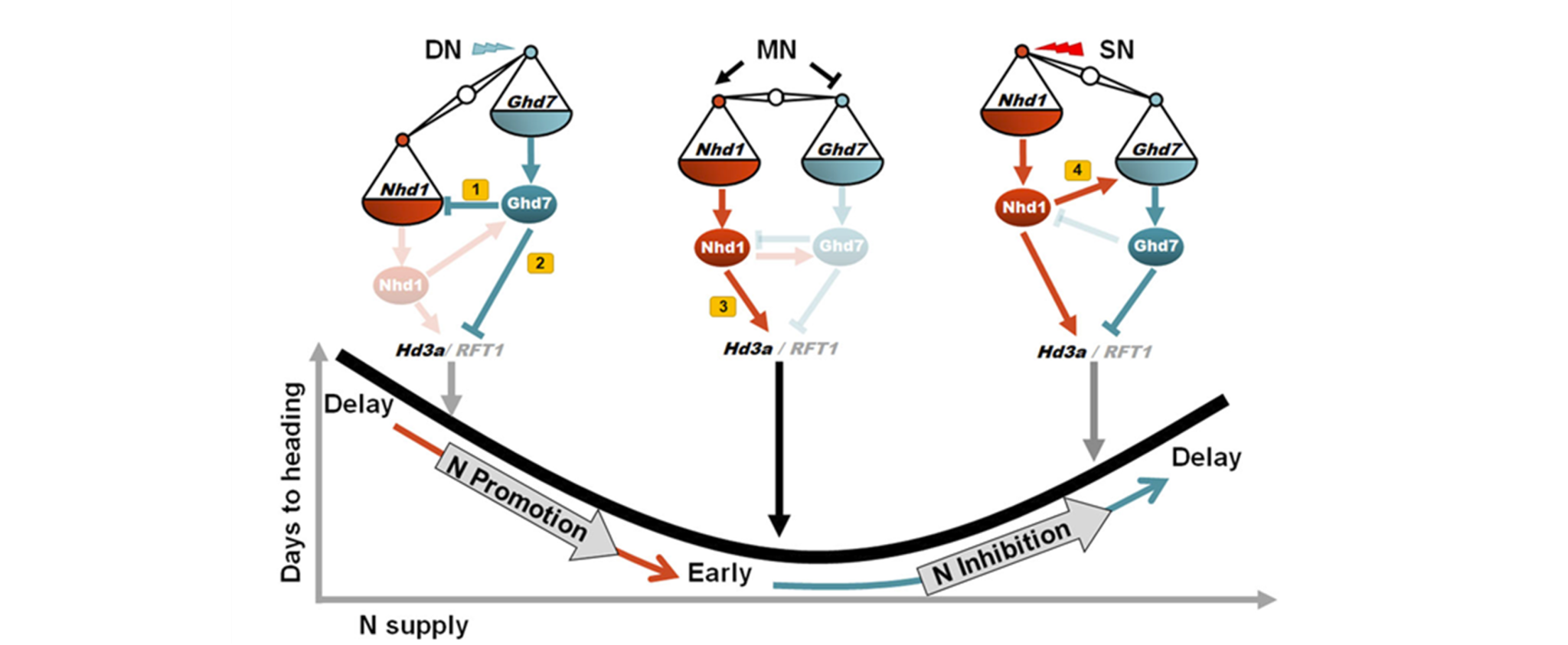 图1. Nhd1-Ghd7转录负反馈调控环介导水稻抽穗期对氮肥的U-型响应。