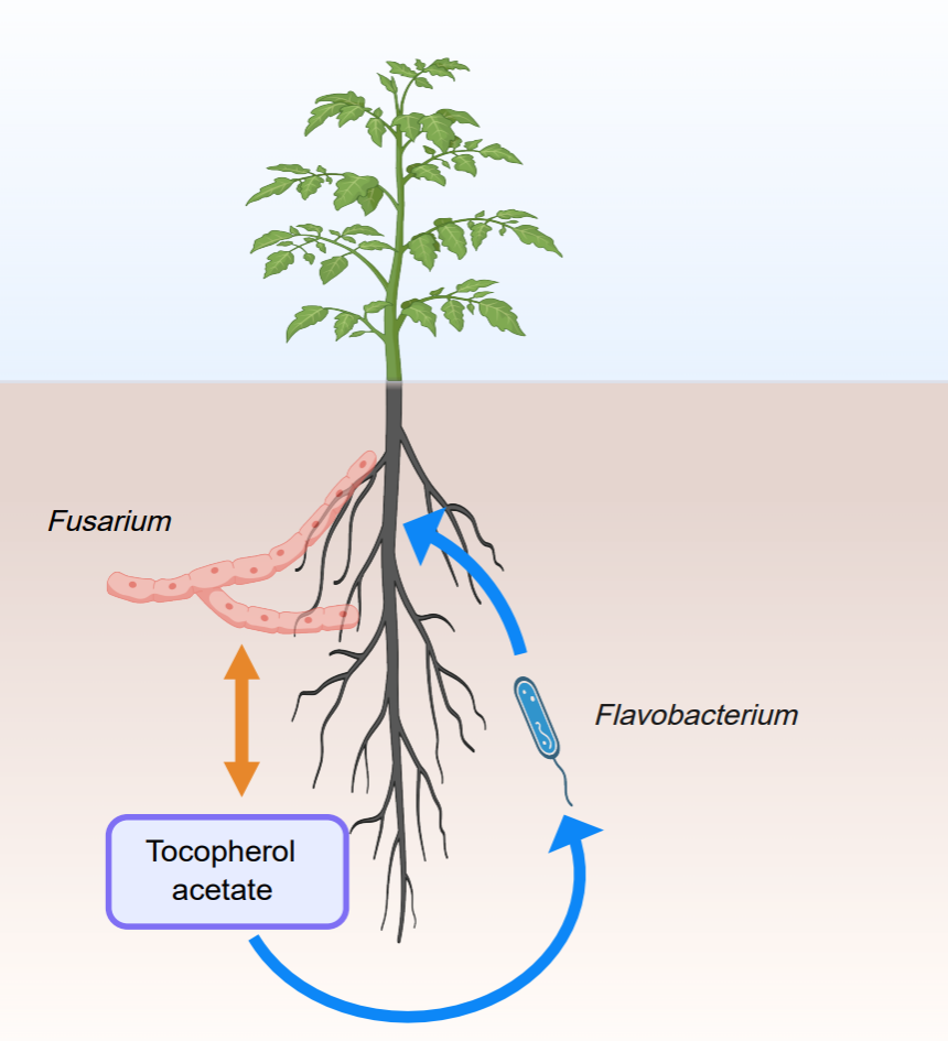 本领域以往研究多集中于单一作物或局部土壤环境,缺乏跨系统的整合分析,限制了普适性规律的发现。本研究通过Meta分析整合了来自多个独立研究的根际微生物组数据,并结合代谢组、宏基因组、转录组,系统揭示了镰刀菌侵染下根际微生物组的功能与结构变化规律。此外,研究团队创新性地提出了“操作性分析单元”概念,将来自不同地点、不同寄主植物根际样本,在尽可能相同的条件下进行分组比较,以剥离环境噪音,捕捉真实的病害信号。研究发现镰刀菌侵染可稳定地改变根际细菌群落结构。其中,黄杆菌属在发病植株根际显著富集,并可抑制病原菌生长。进一步研究通过代谢组鉴定到发病植株根系分泌物中的生育酚显著富集,该物质能促进根际黄杆菌生长。黄杆菌与生育酚联合使用可显著降低番茄枯萎病的发病指数,并有效提升根际黄杆菌丰度。研究成果为开发基于“有益菌-根系分泌物”协同的土传病害生态调控策略奠定了重要理论基础。