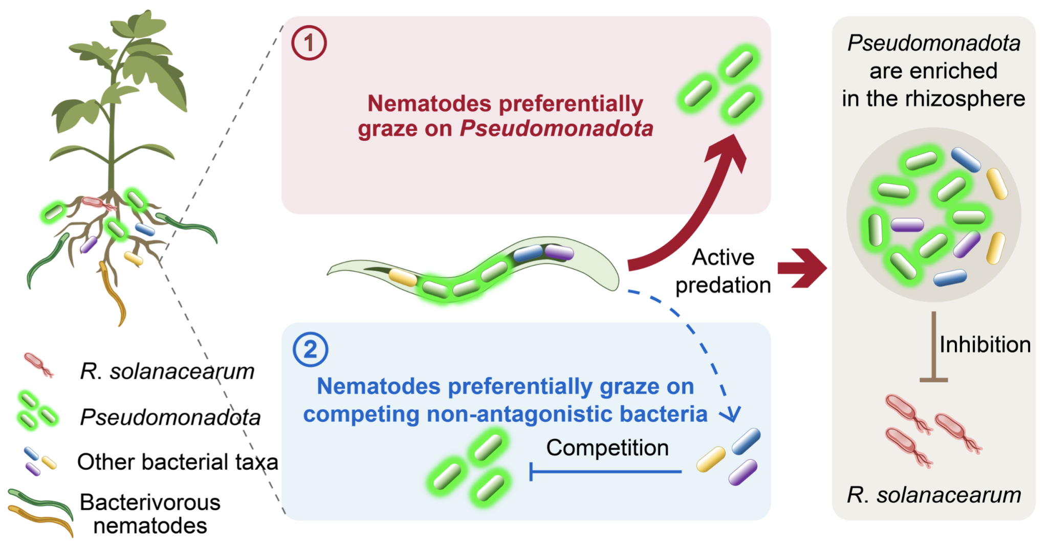 研究发现:1) 线虫与假单胞菌门关联更强的样地,其细菌性青枯病发病率更低;2) 线虫捕食选择性地在根际富集假单胞菌门,同时降低青枯菌密度和植株发病率;3) 偏好放牧驱动了这一富集过程:假单胞菌门在线虫肠道细菌序列中占比超过95%,且该偏好类群具有中等拮抗能力、较小细胞体积和较高代谢活性。