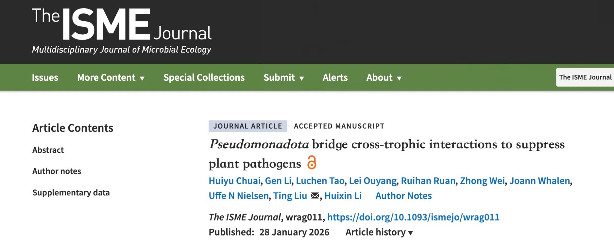 胡锋教授团队发现,假单胞菌门作为关键“桥梁”类群,能够连接微生物群落与更高营养级消费者,通过跨营养级互作抑制病原菌并促进植物健康。相关研究成果以“Pseudomonadota bridge cross-trophic interactions to suppress plant pathogens”为题,发表在微生物生态学领域权威期刊《The ISME Journal》。