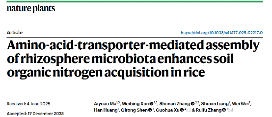 近日,南京农业大学沈其荣院士团队张瑞福教授课题组与徐国华教授团队合作,在国际权威期刊《Nature Plants》上发表了题为“Amino acid transporter-mediated assembly of rhizosphere microbiota enhances soil organic nitrogen acquisition in rice”的研究成果。该研究整合植物遗传学、微生物组学与土壤有机培肥研究,揭示了水稻通过氨基酸转运蛋白的遗传变异、进而控制根际与有机养分分解和吸收相关的微生物组装配、从而达到在肥沃或有机培肥土壤中高效利用氮素养分的适应性进化策略,为提高有机养分利用效率和有机肥效提供了理论基础和微生物菌群产品。